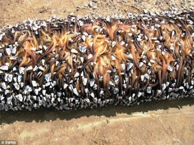 In the days before it was realised that birds migrate, it was thought that barnacle geese,Branta leucopsis, developed from this crustacean, since they were never seen to nest in temperate Europe, hence the English names "goose barnacle", "barnacle goose" and the scientific name Lepas anserifera (Latin anser = "goose"). The confusion was prompted by the similarities in colour and shape. Because they were often found on driftwood, it was assumed that the barnacles were attached to branches before they fell in the water. TheWelsh monk, Giraldus Cambrensis, made this claim in his Topographia Hiberniae.
